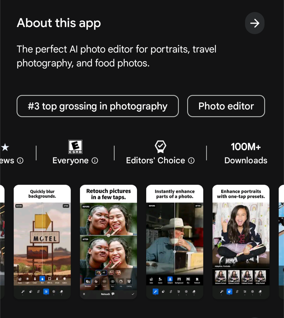 Contributing to 100M+ lifetime downloads on the Google Play Store, as well as being ranked #3 top grossing Photography app.